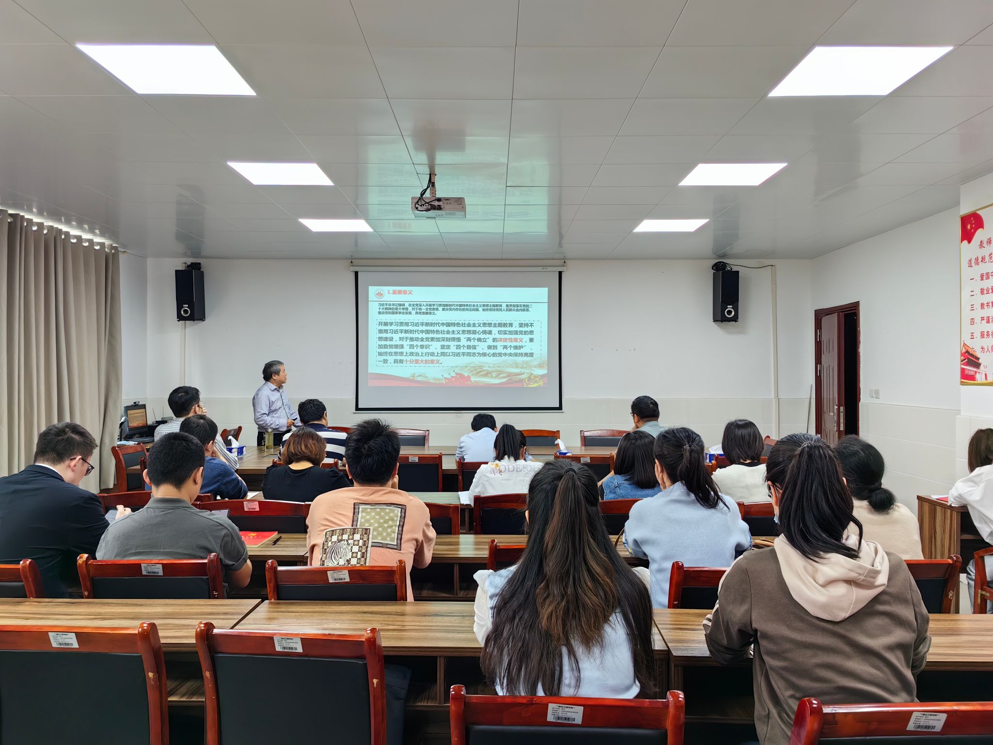 汪连生同志从开展2023年主题教育重要意义、总要求、根本任务,习近平新时代中国特色社会主义思想主要内容,推动学习贯彻习近平新时代中国特色社会主义思想走深走实及学习体会等四个方面,深入浅出,联系实际地为教师党员们分享了他的思考。